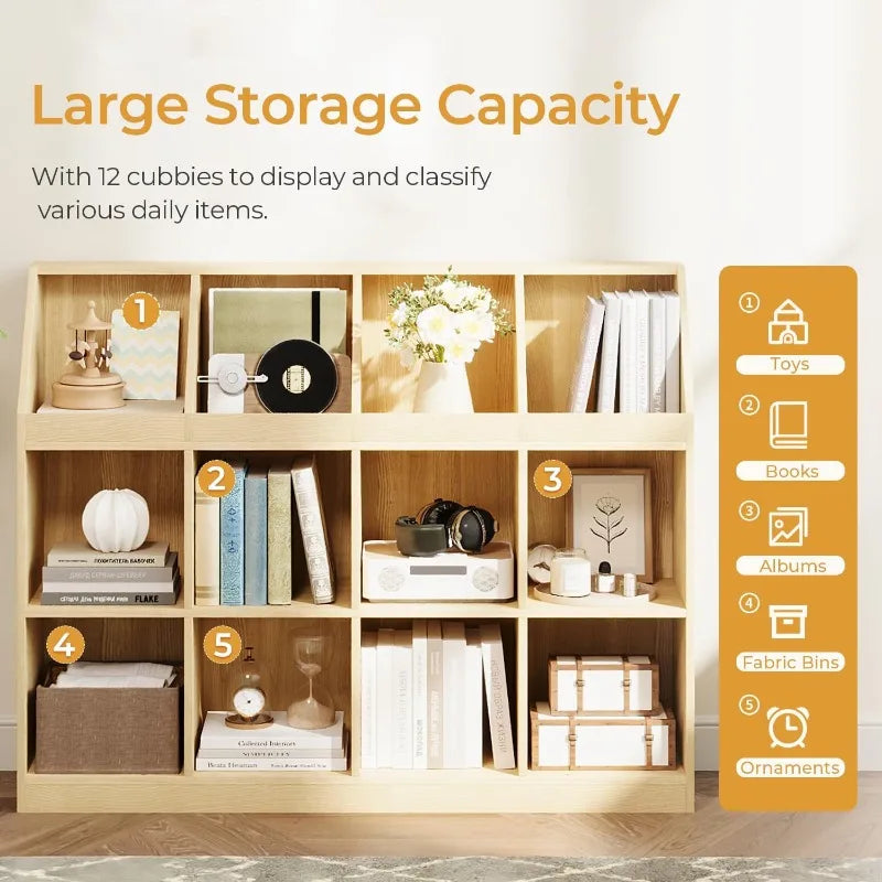 Organize your space with a stylish, 12-cube wooden storage bookcase that blends function and fashion.