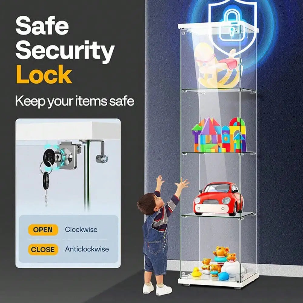 4 Shelf Glass Display Cabinet Glass Curio Cabinet Bookshelf Showcase with Lock