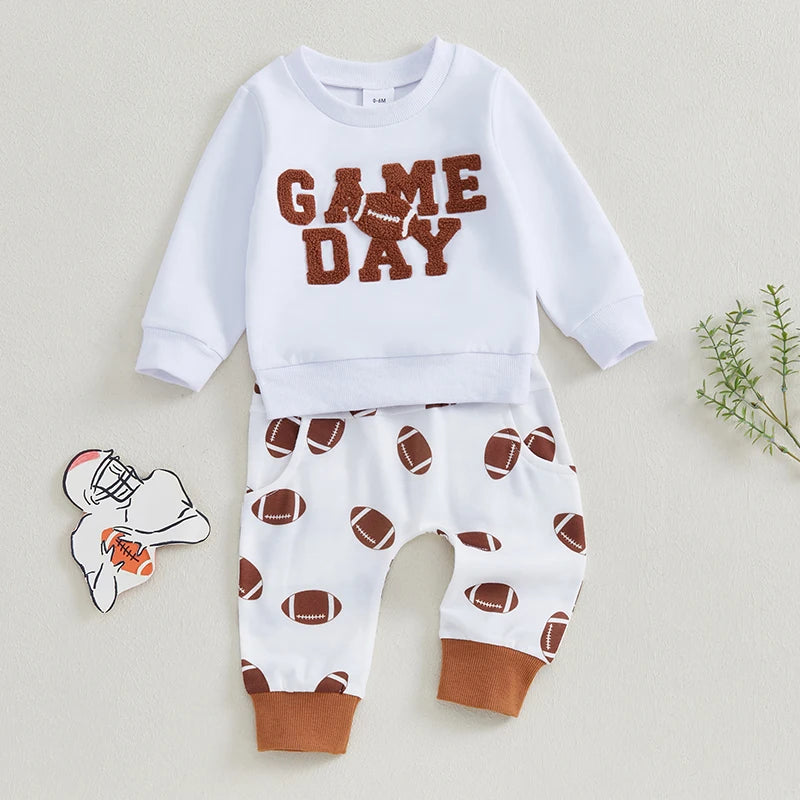 - Sporty design features a long-sleeve pullover top with football-inspired embroidery and an easy O-neck collar for quick on/off.