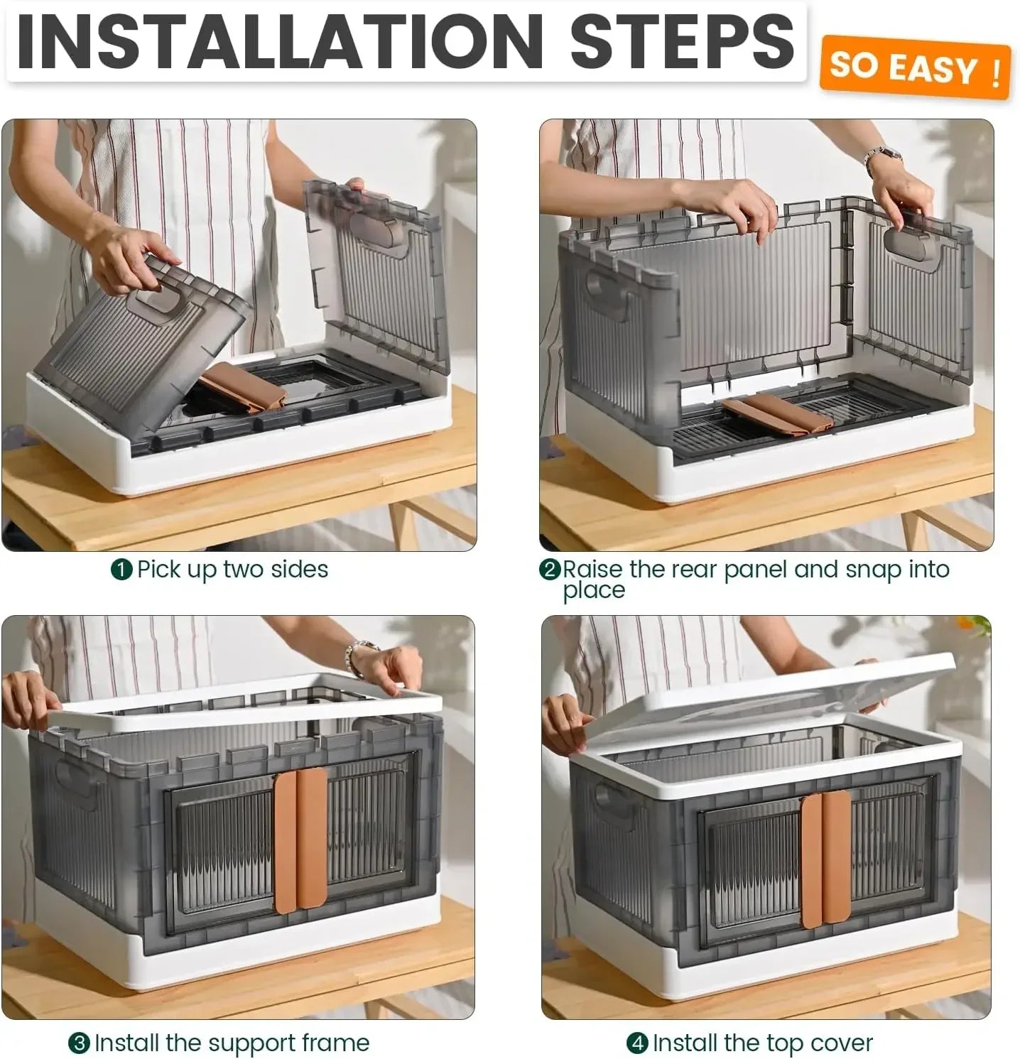 Pick up two sides | Raise the rear panel and snap into place | Install the support frame | Install the top cover |